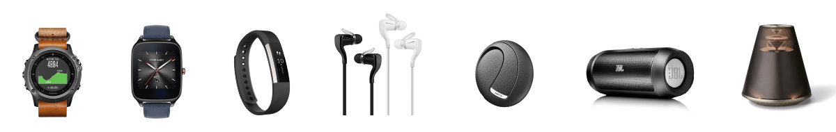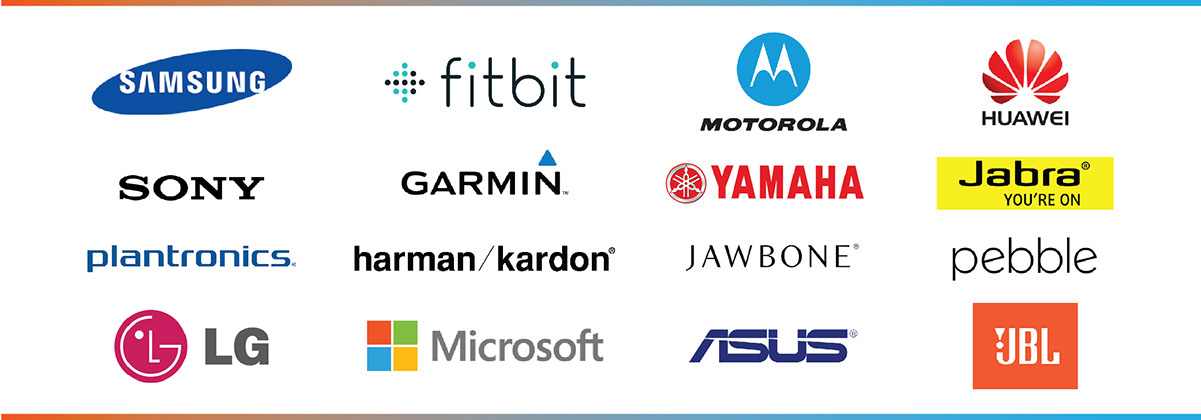 Asus / Fitbit / Garmin / Harman Kardon / Huawei Jabra / Jawbone / JBL / LG / Microsoft / Moto Pebble / Samsung / Sony / Plantronics / Yamaha